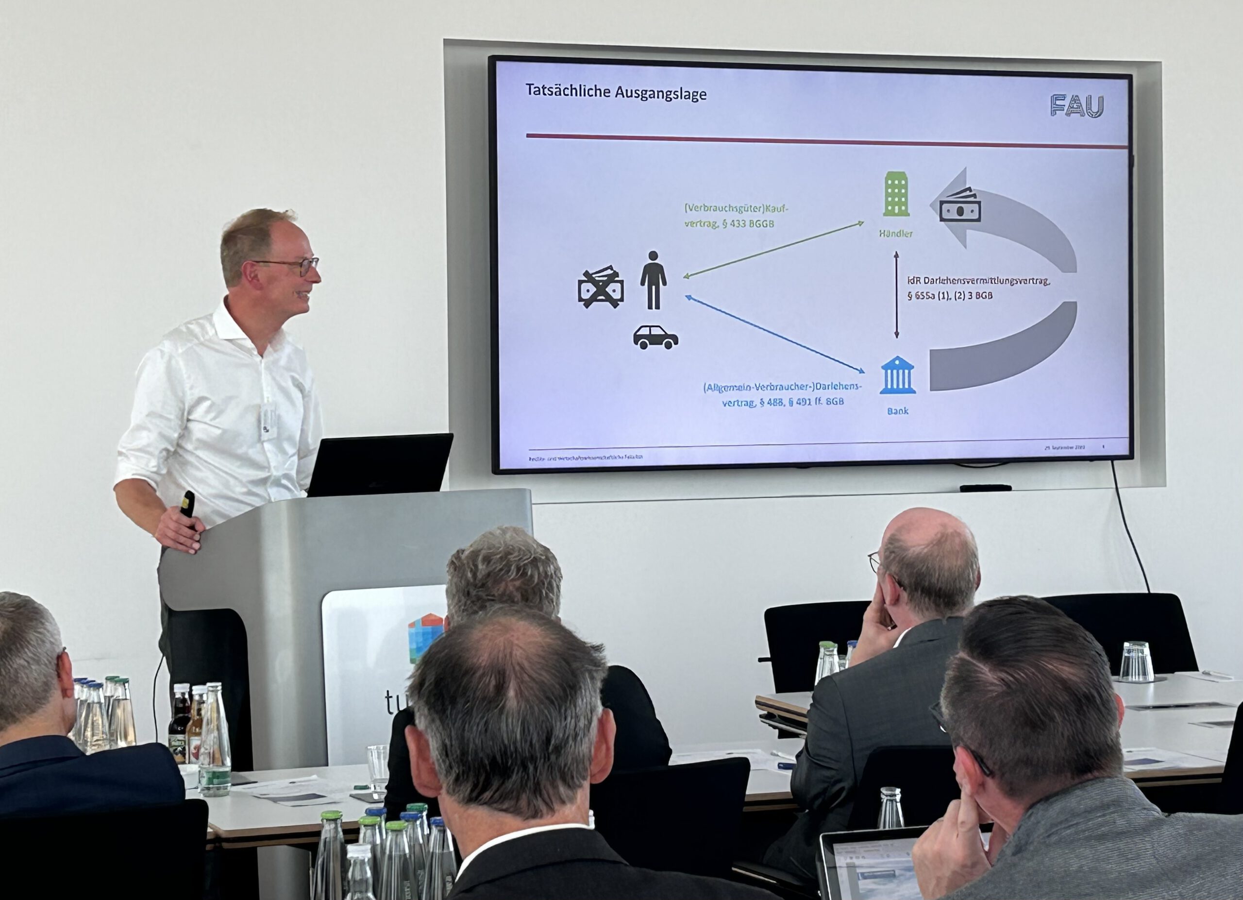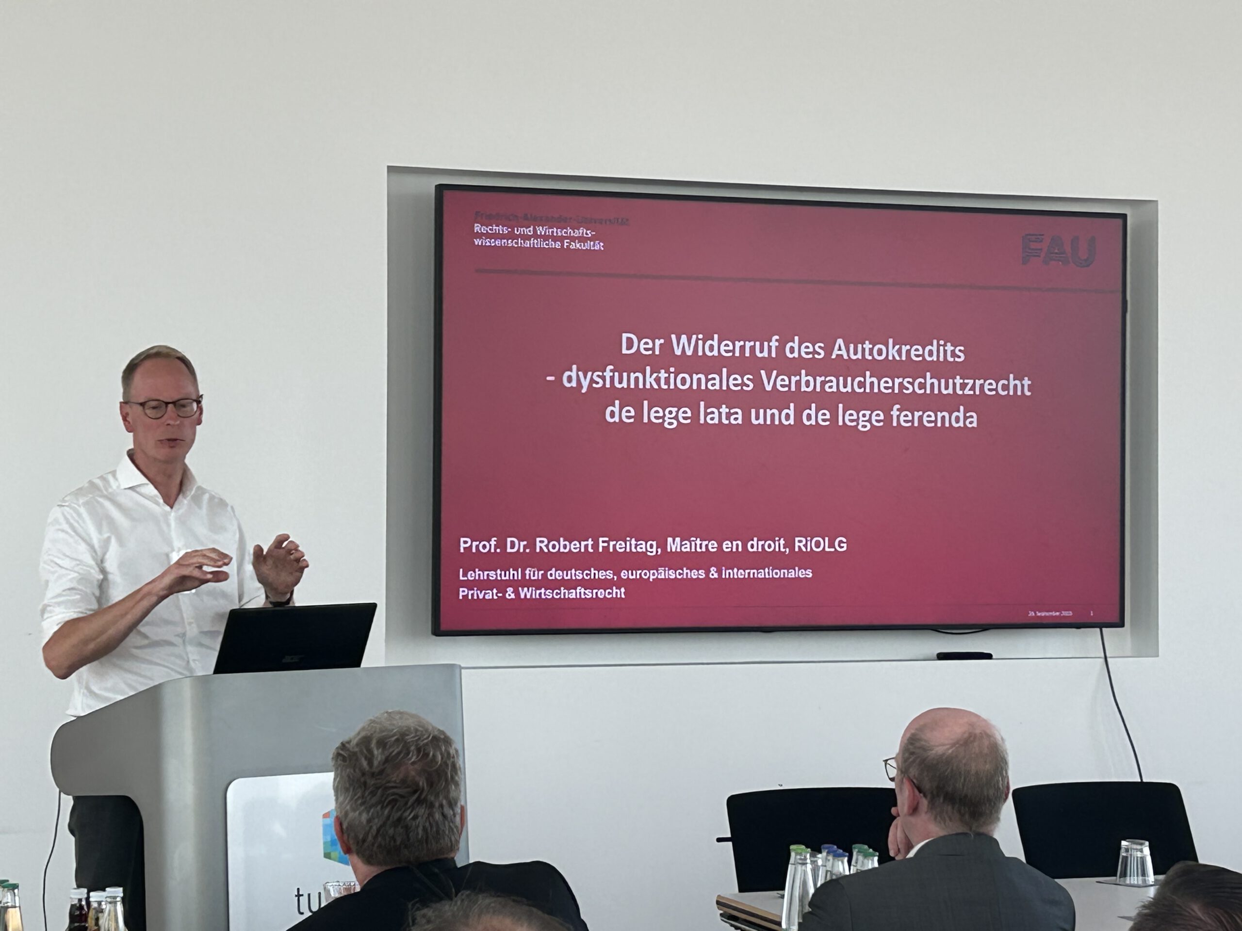 Nachfolgend referierte Prof. Dr. Robert Freitag (Lehrstuhl für Deutsches, Europäisches und Internationales Privat- und Wirtschaftsrecht an der FAU Erlangen-Nürnberg) zum Thema „Der Widerruf des Autokredits – Dysfunktionales Verbraucherschutzrecht de lege lata und de lege ferenda“. Nach der Darlegung der Ausgangssituation eines fremdfinanzierten Autokaufs über eine Herstellerbank erläuterte Prof. Dr. Freitag den dysfunktionalen „Widerrufsjoker“ im europäischen Verbraucherkreditrecht. Darauf aufbauend führte der Referent sowohl Lösungsversuche de lege lata (nach geltendem Recht) sowie potenzielle Lösungen de lege ferenda (nach zukünftigem Recht) aus.