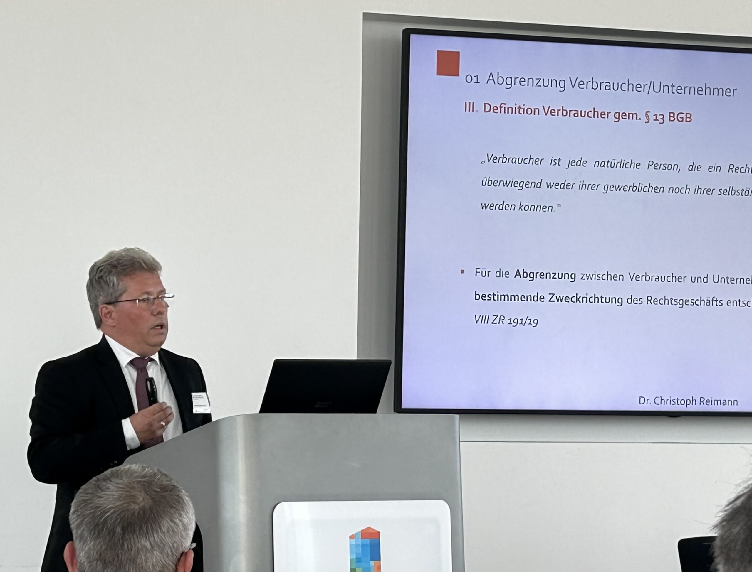 Im ersten Vortrag informierte Dr. Christoph Reimann (Fachanwalt für Bank- und Kapitalmarktrecht, Kanzlei Streitbörger PartGmbB in Hamm) das Plenum zum Thema „Verbraucherschutz: Neuere Entwicklungen im Kredit- und Kreditsicherungsrecht“. Dabei ging er einleitend auf die Differenzierung zwischen Verbrauchern und Unternehmern ein. Im Kontext des Verbraucherdarlehensrechts sowie des Kreditsicherungsrechts veranschaulichte Dr. Reimann seine Ausführungen anhand diverser Gerichtsbeschlüsse und -urteile.