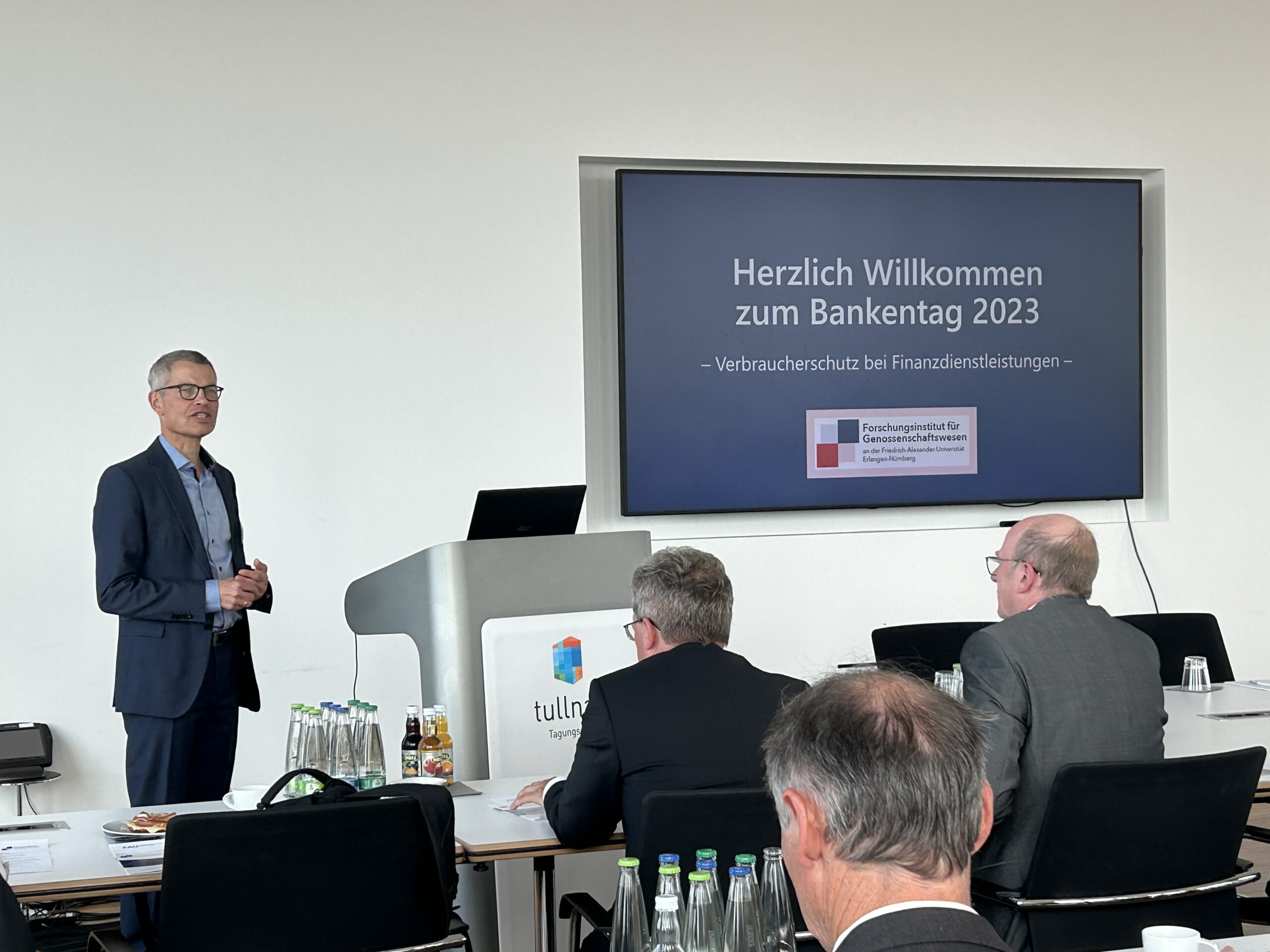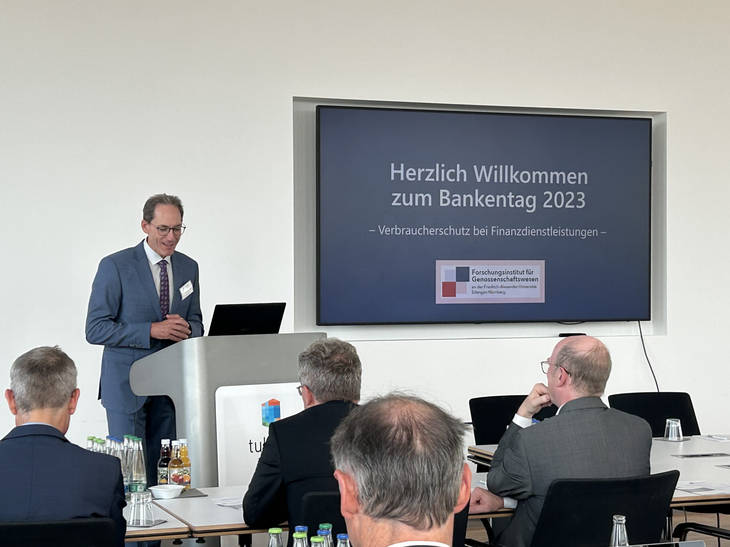 Der alljährliche Bankentag des Forschungsinstituts für Genossenschaftswesen in Nürnberg fand am Freitag, den 29.09.2023 im Hause der VR Bank Metropolregion Nürnberg eG, statt. Das zentrale Thema in diesem Jahr lautete „Verbraucherschutz bei Finanzdienstleistungen“ (vgl. Programm). In diesem Kontext referierten drei Experten zu unterschiedlichen Themenschwerpunkten, worauf eine gemeinsame Podiums- und Teilnehmerdiskussion folgte. 22 Vertreterinnen und Vertreter der Bankenbranche folgten der Einladung und nahmen am Bankentag teil.