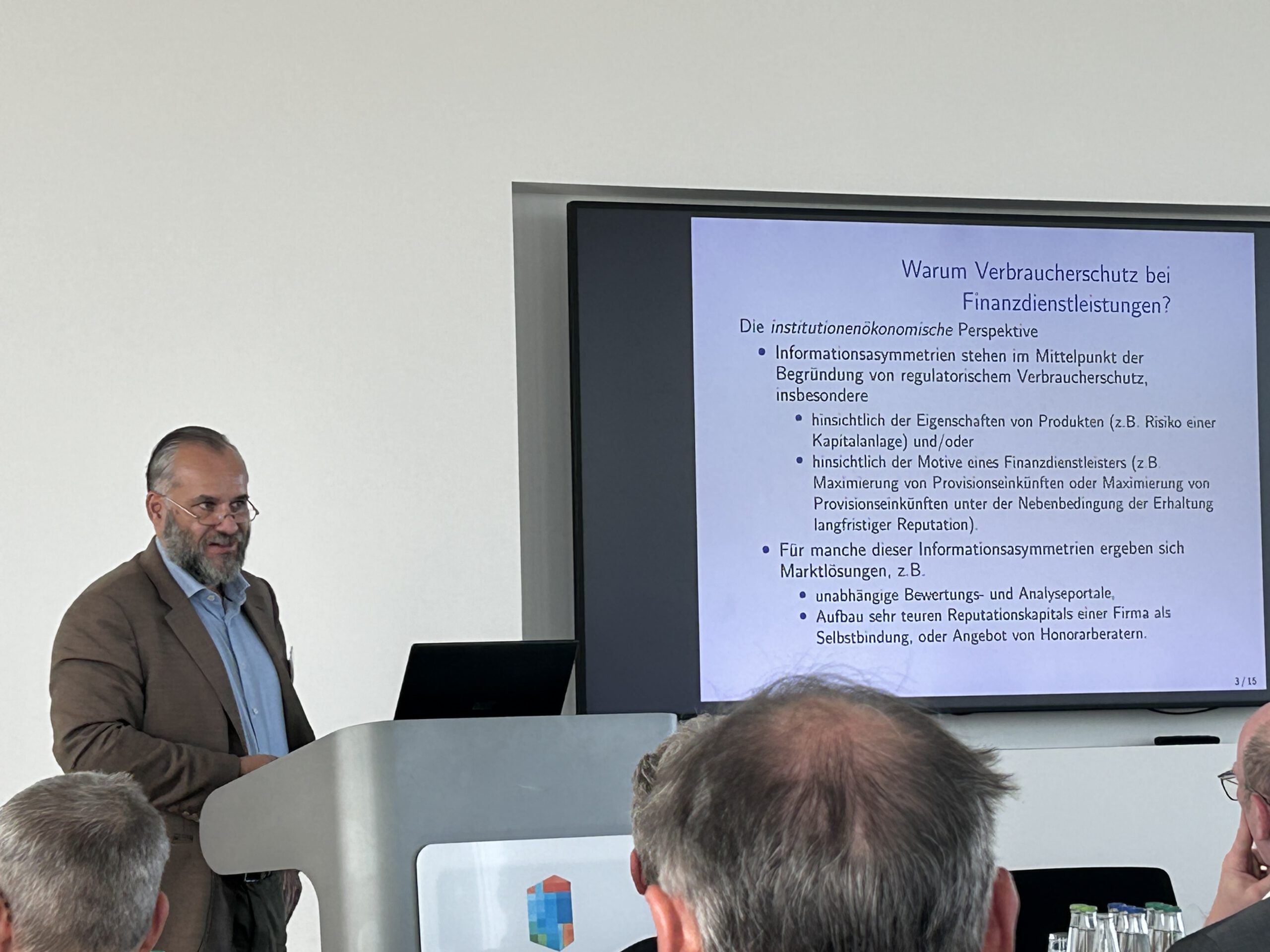 Prof. Dr. Jan Schnellenbach (Brandenburgische Technische Universität Cottbus-Senftenberg) rundete den Vortragsteil des Bankentags mit seinem Referat zum Thema „Verbraucherschutz bei Finanzdienstleistungen aus institutionenökonomischer Sicht“ ab. Zunächst veranschaulichte der Referent die Entwicklung des Verbraucherleitbildes aus institutionenökonomischer sowie verhaltensökonomischer Sicht. Anschließend erörterte Prof. Dr. Schnellenbach, inwiefern der Verbraucherzentrale Bundesverband (vzbv) seiner Aufgabe des kollektiven Verbraucherschutzes gerecht wird.