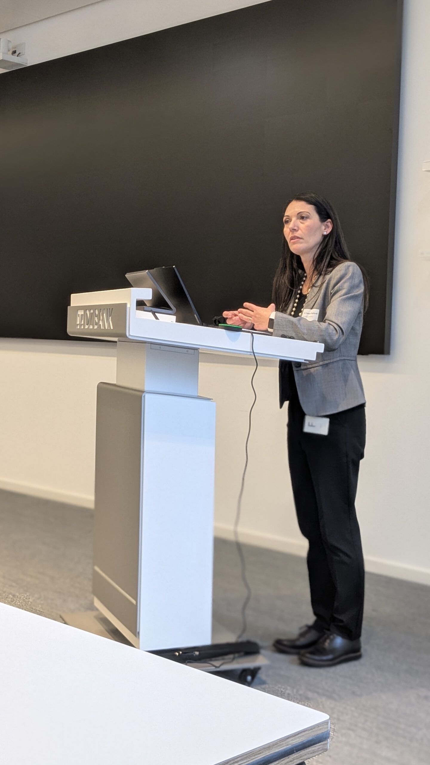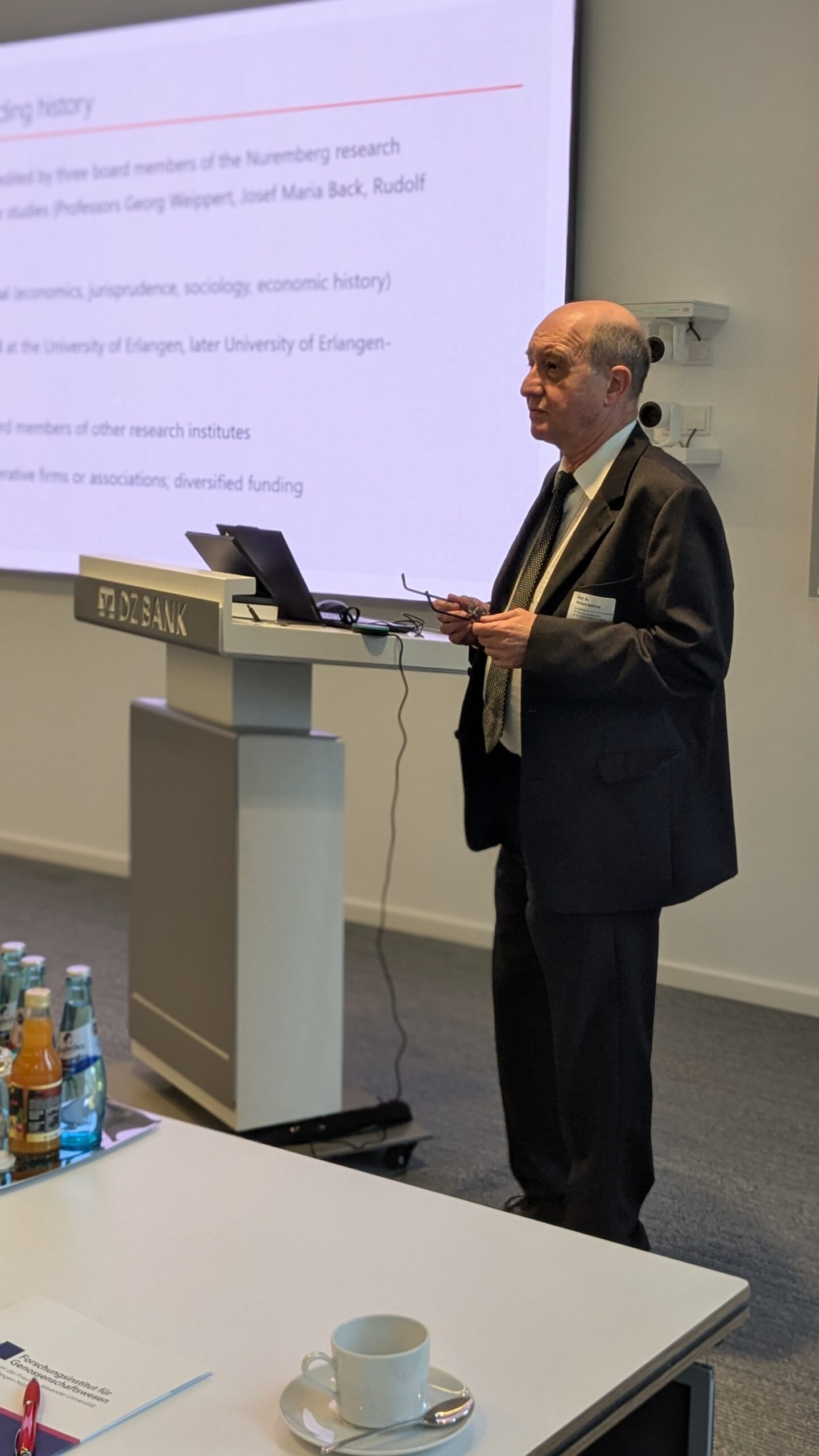 Nach einer gemeinsamen Mittagspause am Buffet folgte mit Prof. Hans Groeneveld (Tilburg University, Rabobank, Niederlande) ein international ausgewiesener Experte für genossenschaftliches Bankwesen. In seinem Vortrag „European Cooperative Banks: Contemporary Relevance, Unique Features, and Emerging Challenges“ analysierte er die besonderen Strukturen und Herausforderungen genossenschaftlicher Banken in Europa und verdeutlichte insbesondere die gesamtwirtschaftlich stabilisierenden Wirkungen der Kreditgenossenschaften, unabhängig vom jeweils verfolgten Geschäftsmodell. Höchst aufschlussreich war auch der Vergleich europäischer Kreditgenossenschaften mit den deutschen Volks- und Raiffeisenbanken, beispielsweise im Hinblick auf die Entwicklung der Mitgliederzahlen.